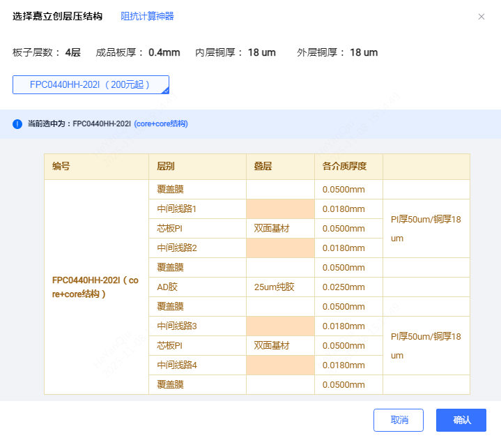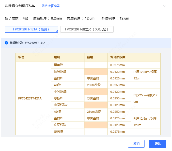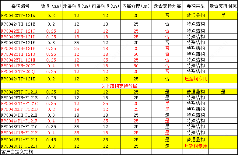 以下为嘉立创系统上目前可选的结构(会持续增加),其中黄底标注的为嘉立创推荐结构,如无特殊要求,建议优先用FPC0420TT-121A。