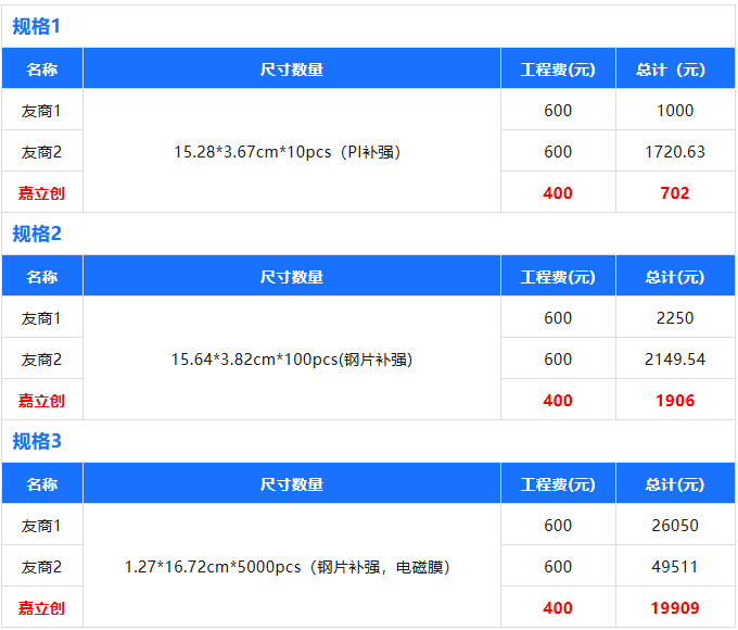 通过与2家友商的价格对比发现:嘉立创在工程费和总价上均占优势,相同规格下定制成本可直降30%-50%。