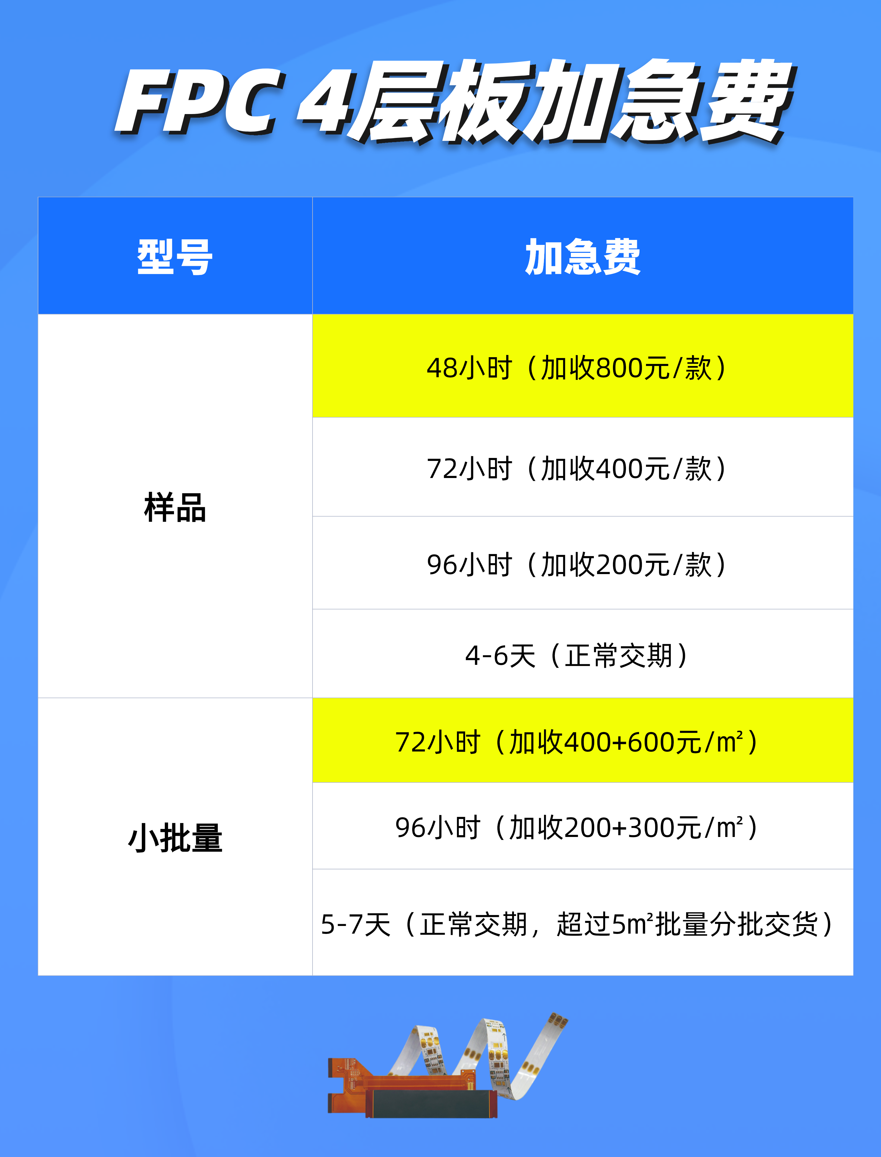 对于研发打样和量产补单等紧急需求,嘉立创FPC多层板也有多种灵活交期方案,最快48小时可交付。