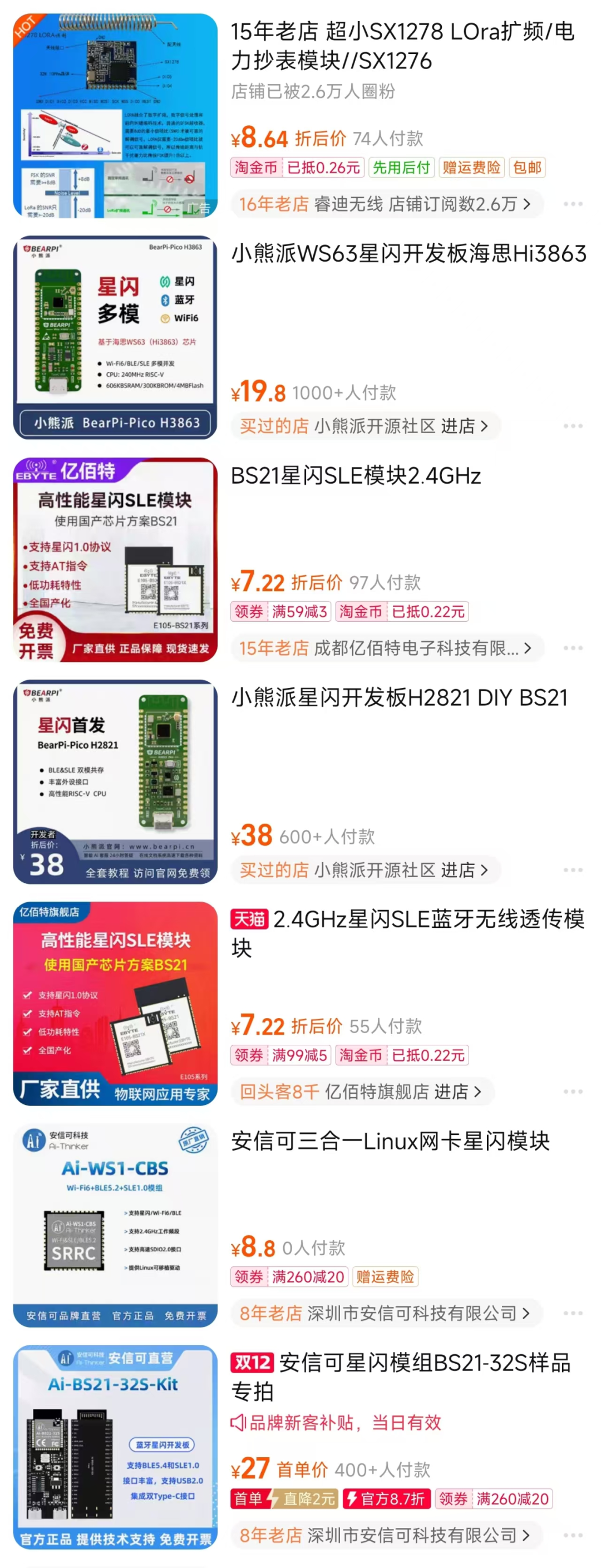 如今一年的时间过去了,这一年忙于各样的事情,一直忘记去了解这方面的情况。知道那天交流群中在讨论星闪模块的时候,出于好奇去淘宝搜了一下。