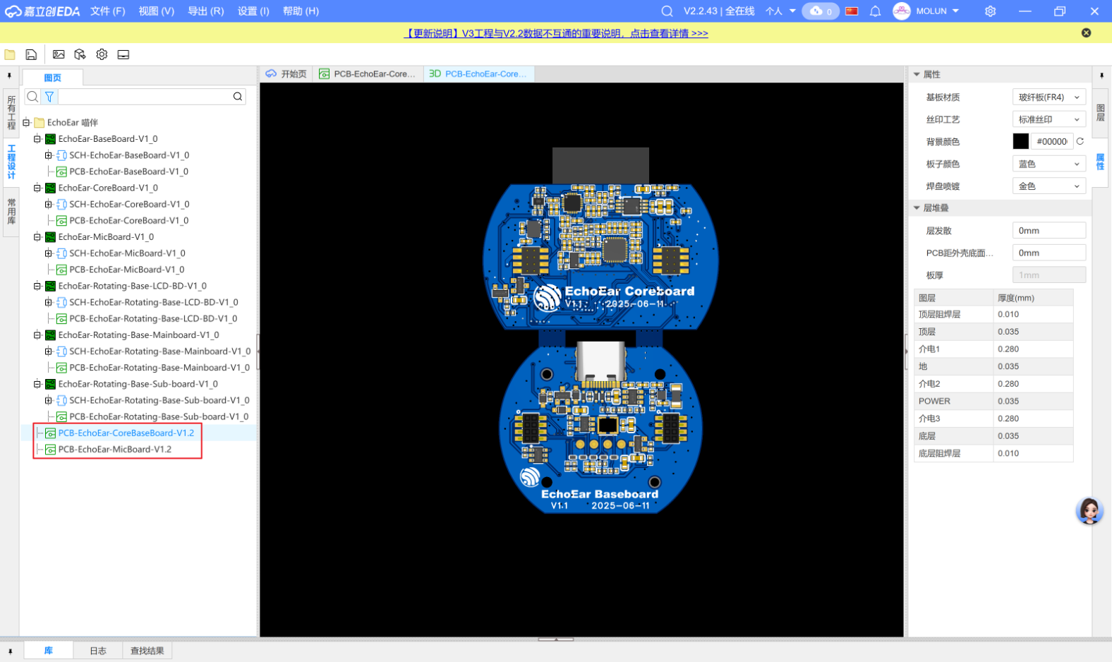 官方实际上有V1.0和V1.2两个版本,但是上面的链接中只有V1.0版本,丝印V1.1,V1.2版本好像并未开放!由于官方文件是多个板子独立的,而且复刻的人多,打板的时候不能顺利下单,于是乎,需要对源文件进行一番修改,我这里上图红框标注的文件及把Baseboard和Coreboard组合到一张PCB中(4层板),MicBoard修改了下丝印和过孔(2层板),最终分为两块板子顺利下单。更有能人把3张板子拼合在一起下单的。
