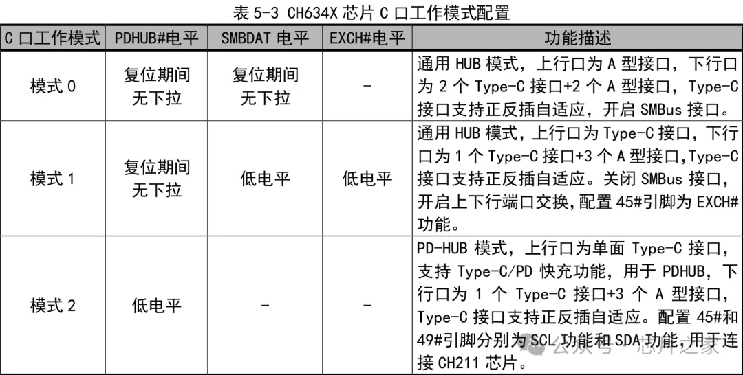 我们先从CH634X开始分析,先看工作模式, CH634X有3种C口工作模式,可通过PDHUB#、SMBDAT和EXCH# 引脚进行配置选择。