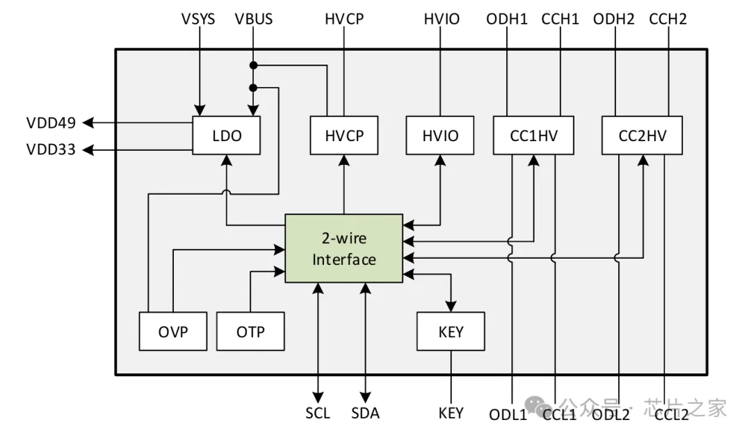这里我们先看一个芯片,CH211C,这是一个内置了高压开关和升压模块的Type-C/PD高压接口芯片。芯片内置了4通道高压开关, 用于MCU的PD信号对接高压Type-C接口,并内置了升压电路,支持外部N型MOSFET功率管控制,CH634X通过I2C控制CH211C。