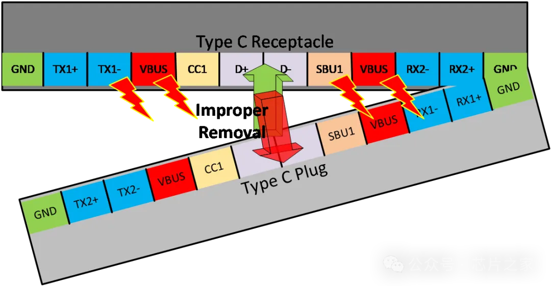 CC信号线主要用来协商电压电流(PD协议通信)、侦测插拔,理论上 CC 线最大电压不会超过 5V,CC线电压是独立于 VBUS 电压的,但在某些异常/热插拔瞬间,有可能由于寄生耦合、ESD、电源反灌等,导致 CC 瞬时电压超过 5V,特别是 Type-C 接口短接插反、VBUS 瞬间上升、或者被错误连接时,可能出现异常电压。