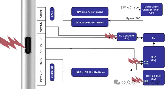 所以,USB PD HUB中高压端和低压端的CC线绝不能直接相连,必须使用高压信号开关进行隔离和控制,避免MCU的CC引脚直接承受意外的高压。