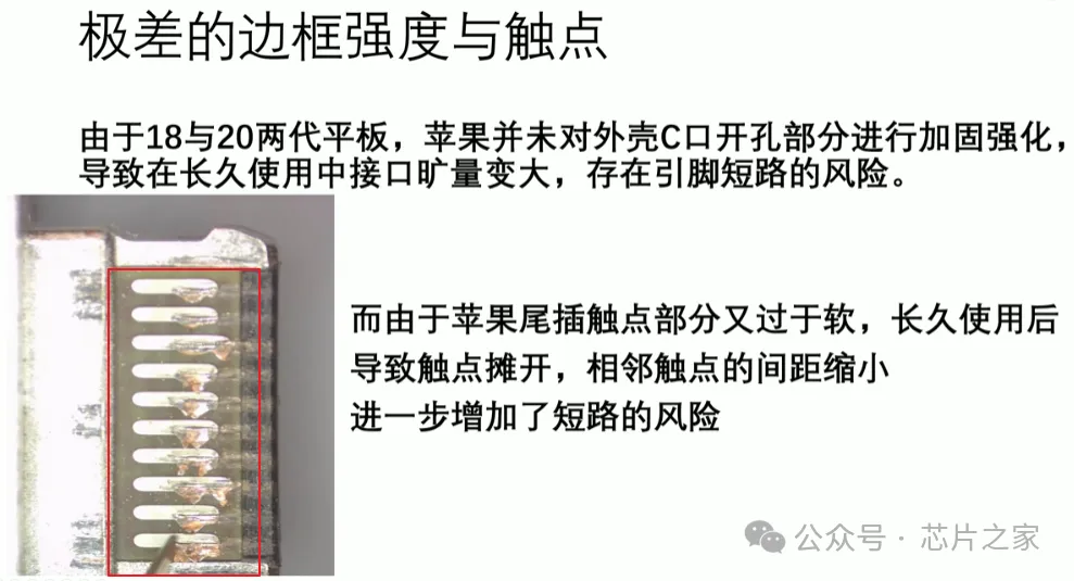 还有就是,C口长期使用后,有一些会导致触点摊开,相邻触点的间距缩小,CC口又紧挨着VBUS口,进一步增加了短路的风险。