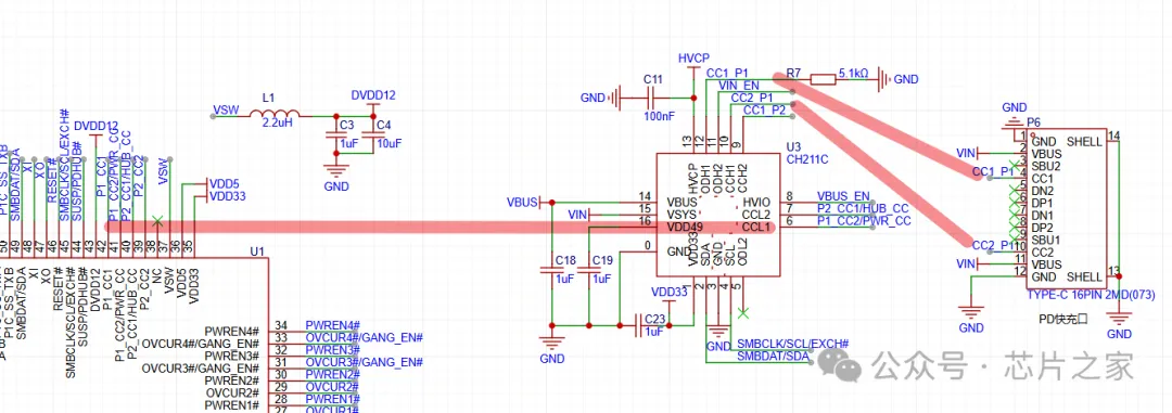如下图,P6口为纯供电的Type-C口,P6的两个CC口与CH211C的高压CC引脚连接,二选一,CH211C的低压CC口与CH634X连接,这样,通过CH211C,外部高压CC口与主控CH634X的低压CC口就硬件上连接起来了。
