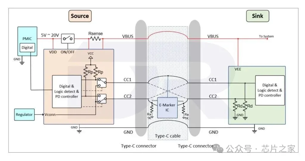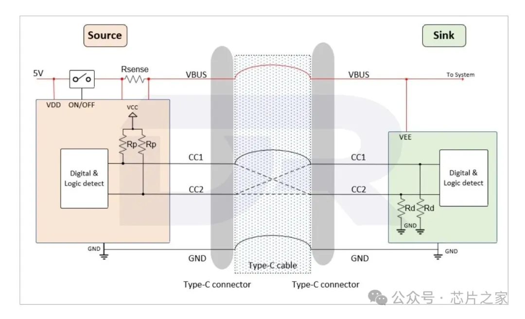 - - Sink(UFP)的CC引脚通过一个下拉电阻(Rd)接到地。