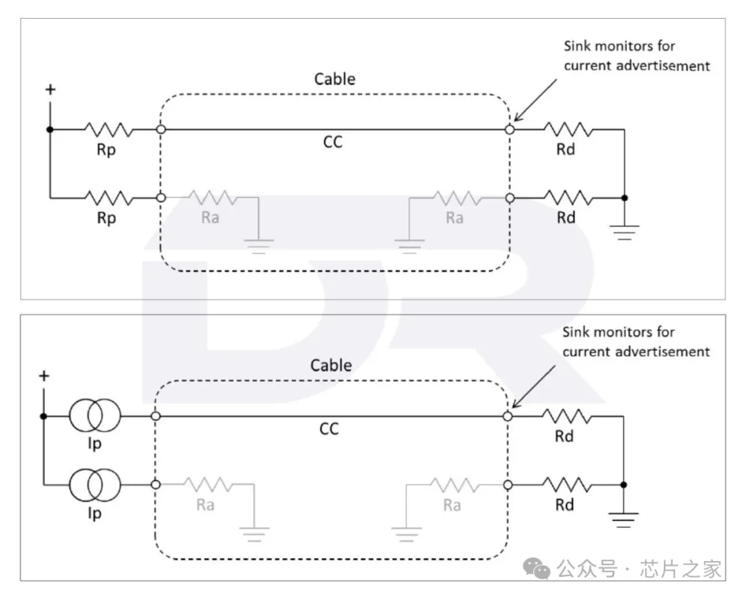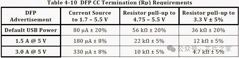 - - Source(DFP)的CC引脚通过一个上拉电阻(Rp)接到电源。