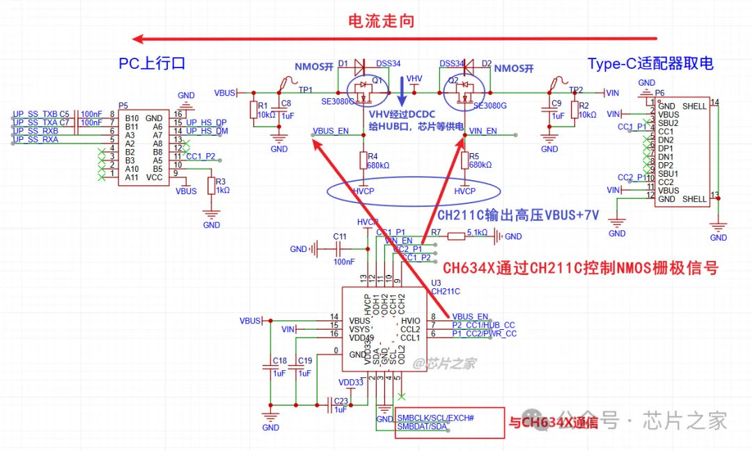 供电路径:PD充电器 → HUB (CH211C开启MOS导通高压) → 上行口C口 → PC 角色: