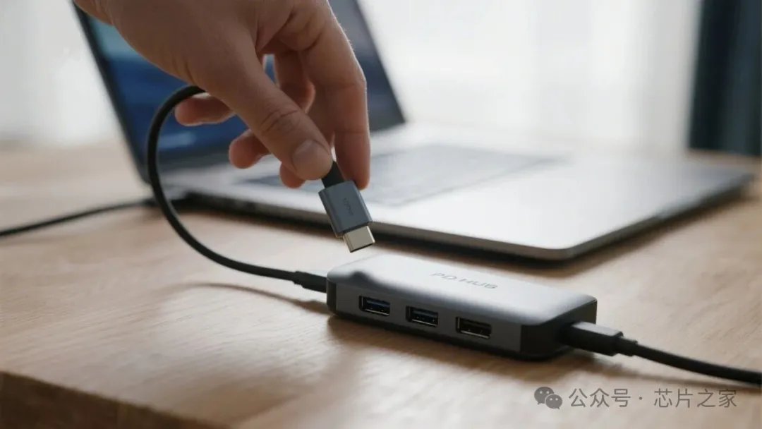 - HUB插入电脑后还没插充电器的时候,VBUS = 5V(来自 PC),HUB 由这 5V 上电并完成枚举(USB 数据链路建立)。