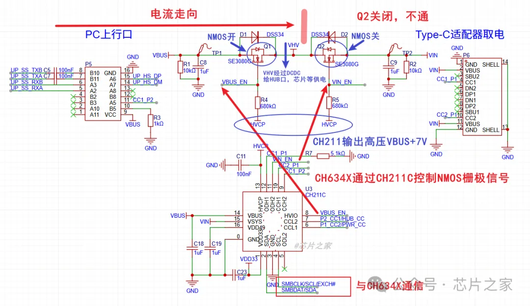 在这个 PD HUB 里,CH634X 是 PD 协商的大脑,处理 CC 上的协议栈;CH211C 是高压守门员,保护CH634X远离高压,同时控制NMOS导通和关断。