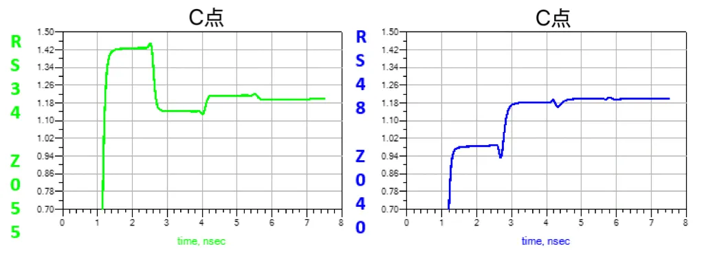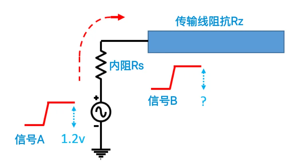 假设信号内阻Rs为48欧姆,传输线内阻为40欧姆,信号A的振幅为1.2V,那到传输线后面B点的振幅就是545mV;如果信号A的驱动能力强一点,内阻降低为34欧姆,那B点的振幅就是649mV。