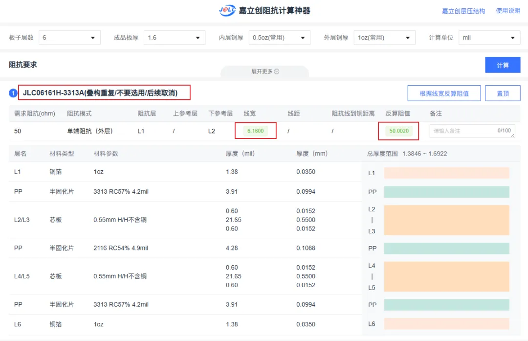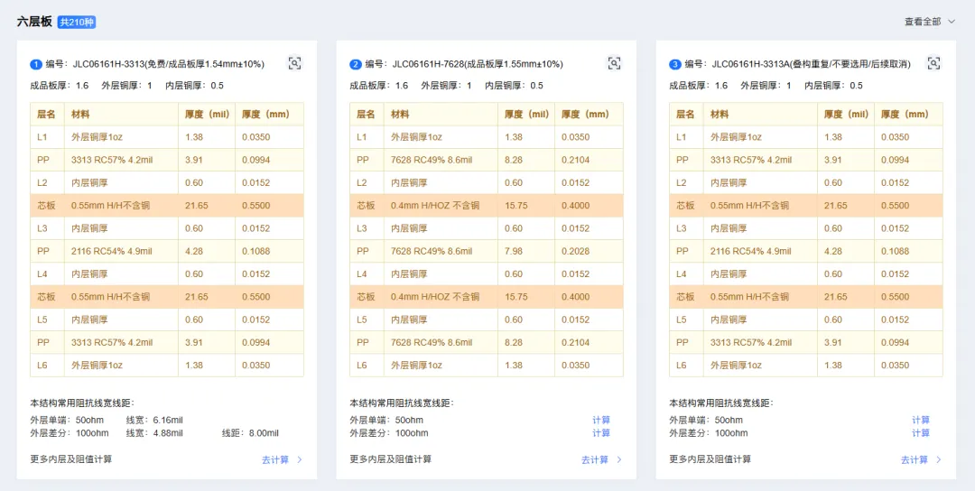 这里有很多常用的层压结构,我们选好自己的层压结构之后,常用的阻抗对应的线宽就都显示出来了。