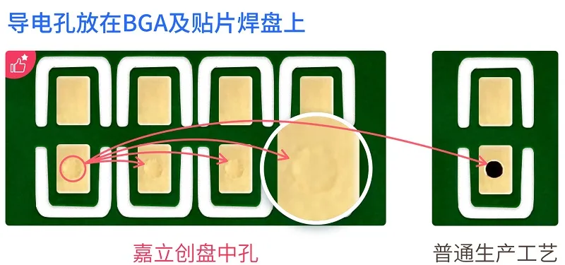 再加上免费的盘中孔工艺,焊盘上直接打孔,盘中孔工艺的PCB,无论是美感还是性能,均秒杀过孔盖油及塞油。而且采用盘中孔设计,还能大大节省设计时间,提升产品品质。