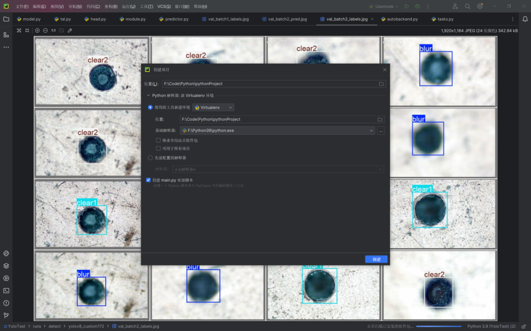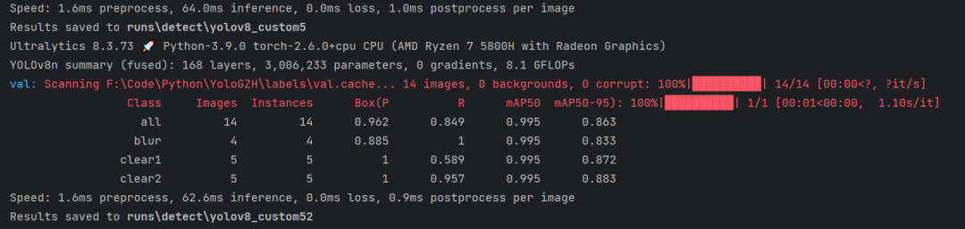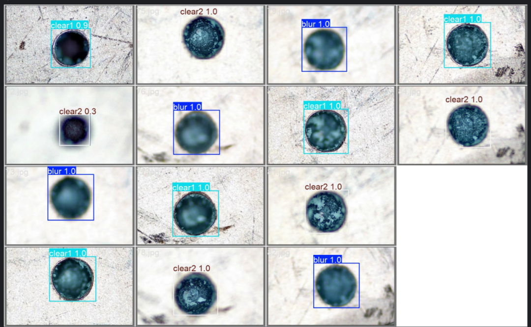 我这里的标签是:blur是模糊的照片,clear1是外孔清晰照片,clear2是内孔清晰照片,数字是置信度,除了第五张图片的置信度为0.3之外,其他的都非常准确。