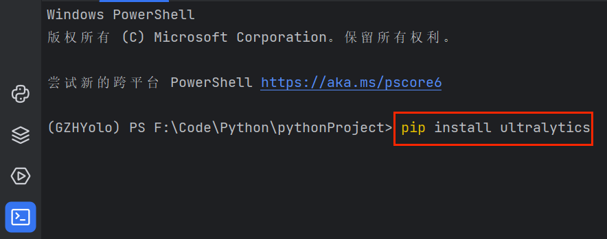 接下来利用Pycharm创建一个新的工程,在终端中可以输入如下代码安装Yolo。