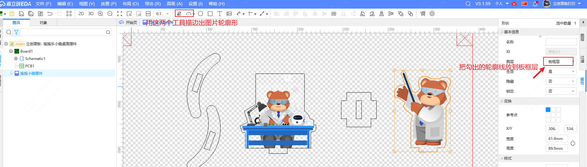 把自己想DIY的图片导入替换小嘉图片,用钢笔工具描出外轮廓形,再画一个矩形跟描好的轮廓线用布尔运算合并区域,最后放到板框层,更详细教程点击 立创面板- 摇摇乐小嘉桌面摆件 - 立创开源硬件平台