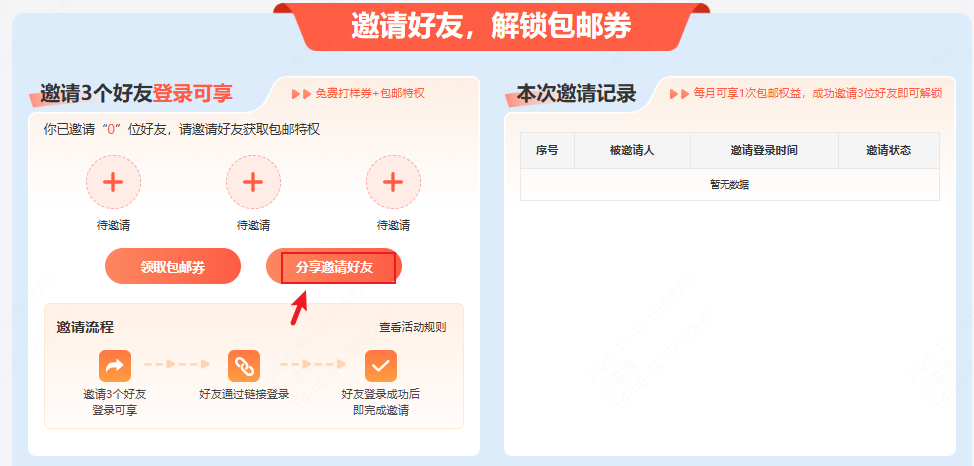 3. 免费打样中心领券,分享邀请好友还能减免运费。