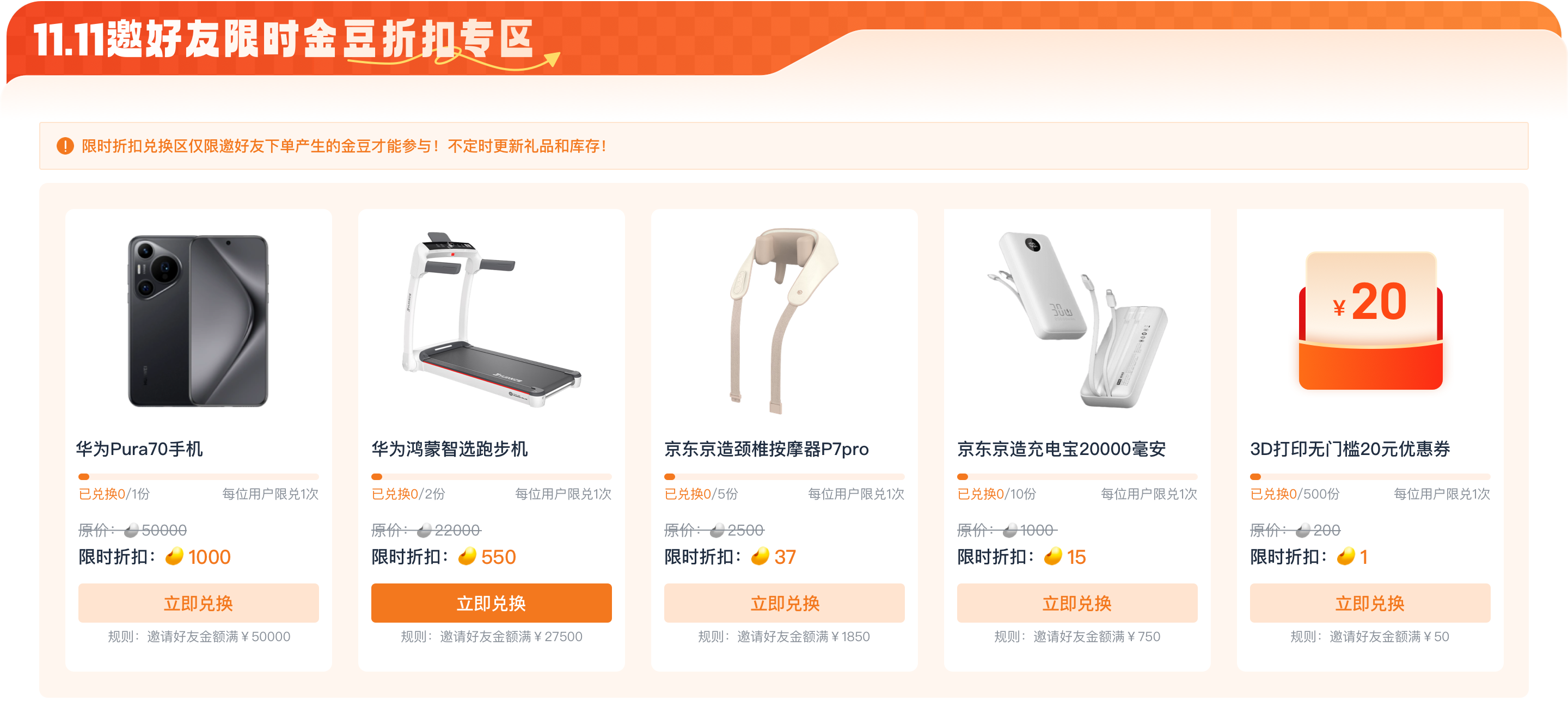 11月1日起,嘉立创3D打印【邀好友下单,赚返利·兑千款好礼】活动重磅焕新!“金豆超级折扣专区”限时上线!用最少金豆兑换最值豪礼,实打实回馈长期支持的用户