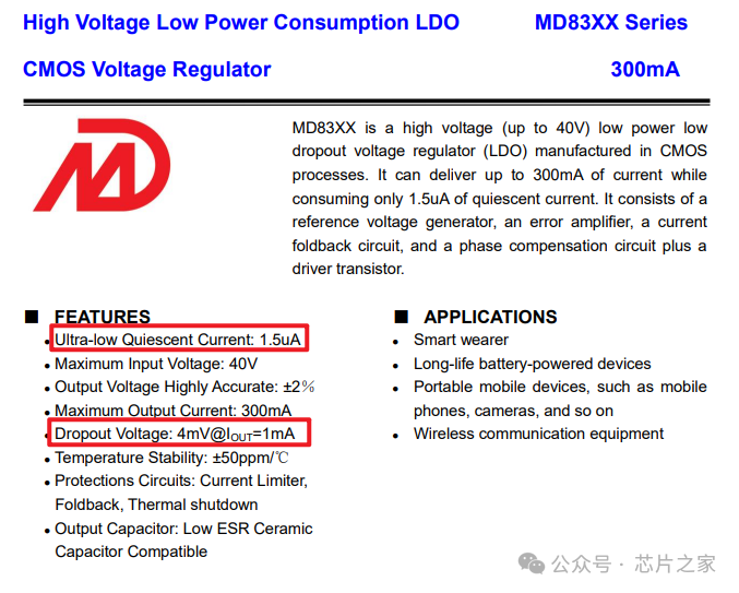 LDO型号为8321A,品牌为明达微,通过数据手册我们了解到,这是一颗最高40V的LDO,输出2.1V,静态电流为1.5uA,最大输出300mA。