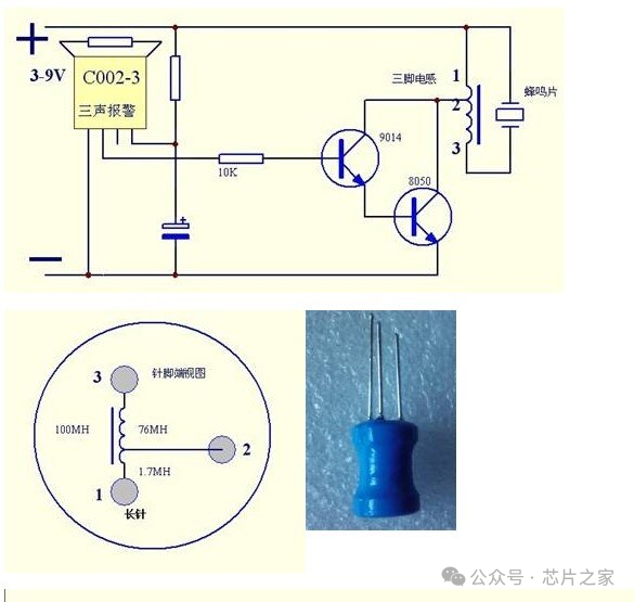 这里核心原理是用了一个三脚升压电感,原理是利用电感的互感特性,将初级电能转化为磁能,磁能感应到次级时,次级将磁能再次转化为电能,初级是一个小感量,次级设计成大感量,当初级流过一个交变的电流时,就能达到一个升压的效果,就能发出我们需要的声音了,电路设计成本低,非常巧妙。