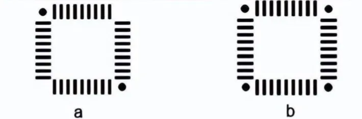 局部mark点 位置应满足以下要求:对于超过 100 个引脚的 QFP 元件,应沿对角线放置 2 个 mark点 ,如图 a 所示。对于引脚数超过 160 的 QFP 元件,应在四个角放置 4 个标记,如图 b 所示。