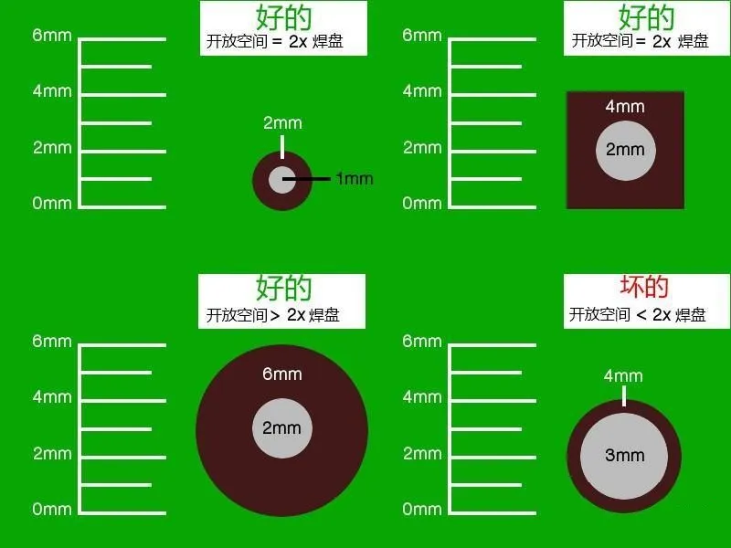 开放空间的直径应至少是焊盘尺寸的两倍。因此,对于 2mm 的焊盘,你需要在其周围至少留出 4mm 的间隙区域。间隙区域的形状不太重要;圆形和方形区域是两种流行的设计。