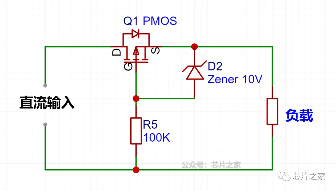 我们知道,PMOS在完全导通后,导通电阻是很小的,常规的几百毫欧,有一些几十毫欧, 我们这里在GS之间加了一个齐纳二极管防止输入电压超过MOS的Vgs,Vgs额定值为20V,我们这里一般用10V的就能满足了,具体根据MOS的实际特性进行齐纳二极管的选择。