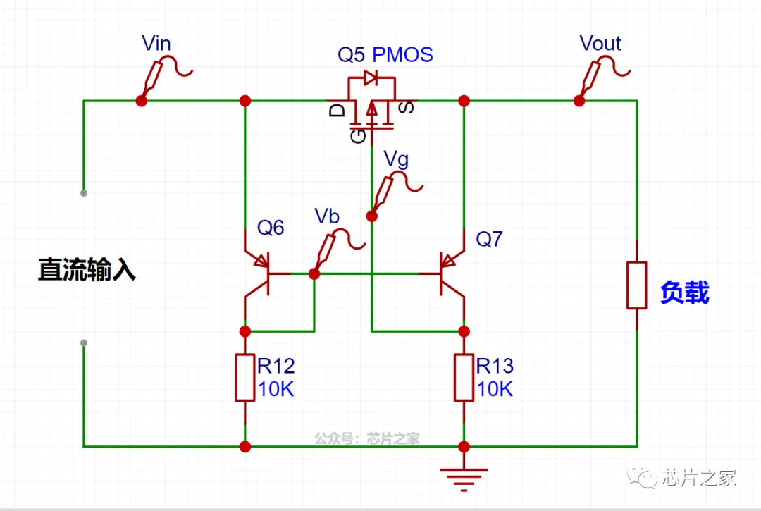 如果Vin被突然关闭,Vb不再受制于输入电压,此时,Vb = Vout -0.65,Q7导通,MOS管G端电压拉高,MOS管关闭,达到防止回流的效果。