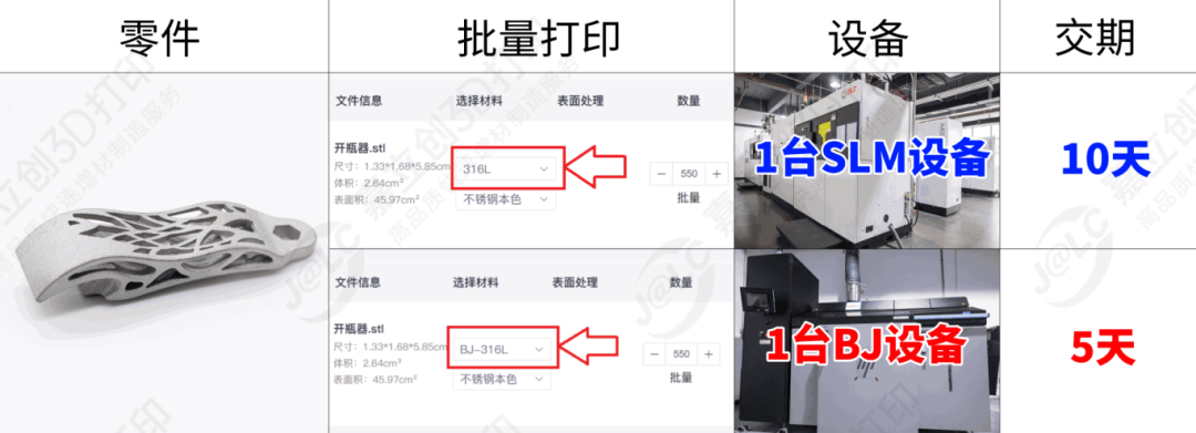 BJ技术主要优势还体现在批量金属件打印速度“快”,其单次材料处理量一缸可达30KG,以生产一批开瓶器为例,通过Metal JET设备一次性能够打印约560件,加上高温烧结,全程仅需5天即可完成交付。