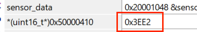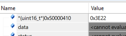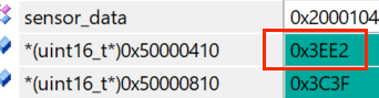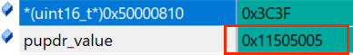 查询IDR寄存器的地址值(STM32U0中GPIO的基地址是0x50000000,GPIOB的偏移地址是0x400,IDR寄存器的偏移地址是0x10,因此GPIOB的IDR寄存器的位置是0x50000410)发现其值是0x3EE2