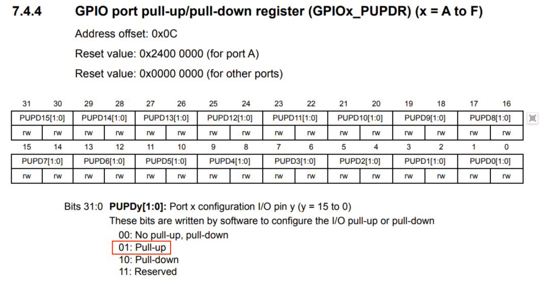 查询芯片手册得知GPIO的PUPDR寄存器记录引脚的上下拉状态,查询该地址的值发现PB6,PB7均是正常的上拉,但是引脚悬空确实实打实存在的问题。于是看看能不能通过外接上拉电阻的情况来解决问题。