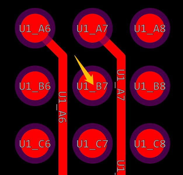 不知道大家在画PCB的时候会不会遇到这样的情况:芯片的引脚太密,某个引脚想要走线出去但是完全被包围了,尤其是在BGA封装的芯片中。例如下图中的U1_B7引脚就没有办法在走线出去,四周都被包围了。