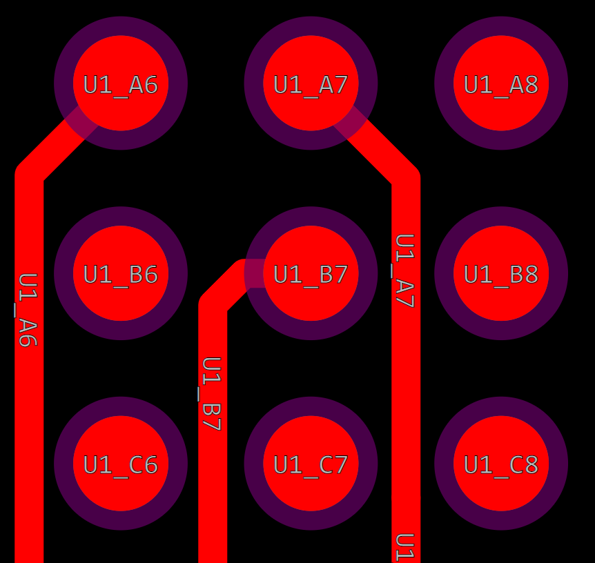当然这只是一个简单的演示,现实情况要比这复杂很多,而且此时有可能会导致U1_B6引脚走线困难。所以说这种方法的缺点很明显,非常浪费时间,而且重新走线不一定能保证可以走通。