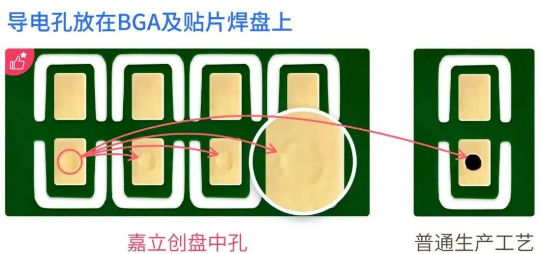 嘉立创推出的盘中孔工艺,采用树脂塞孔然后盖帽电镀,不仅可以将过孔打在任意焊盘和BGA上,而且不会影响后续SMT。怎么做到呢?就是先用树脂把过孔填充起来,烤干树脂磨平,然后在树脂表面镀上铜,这样外观上完全看不出有过孔的痕迹,自然也就不会影响到焊接了。