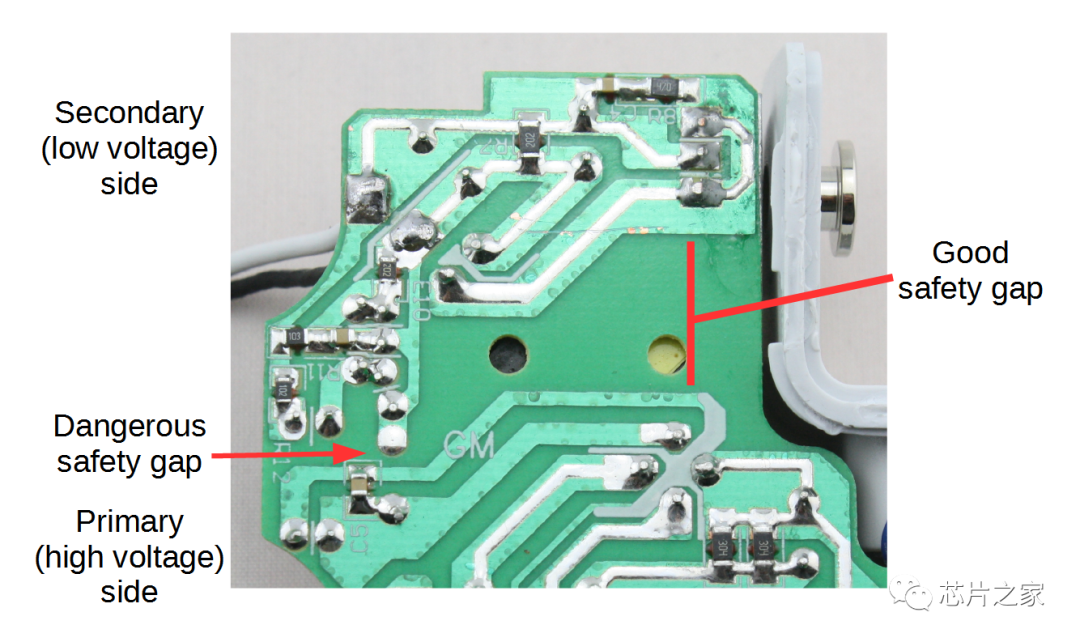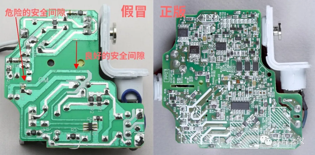 比较困惑的一点是为什么假冒充电器从来没有设法有足够的安全间隙,它们使用简单、低复杂度的电路,因此电路板布局应该很简单才是。除了在最小的立方体手机充电器中,它们并没有为每一毫米的空间而战。