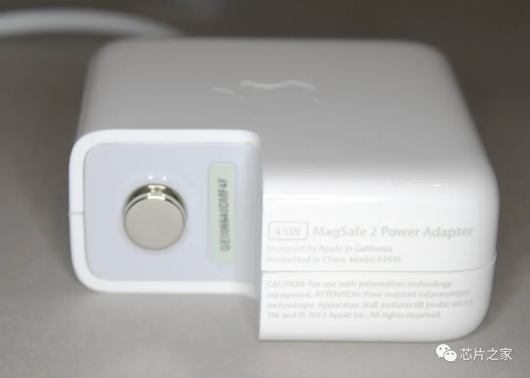 假冒 MagSafe 45W 充电器与正品充电器具有相同的“由 Apple 在加利福尼亚设计”的文字