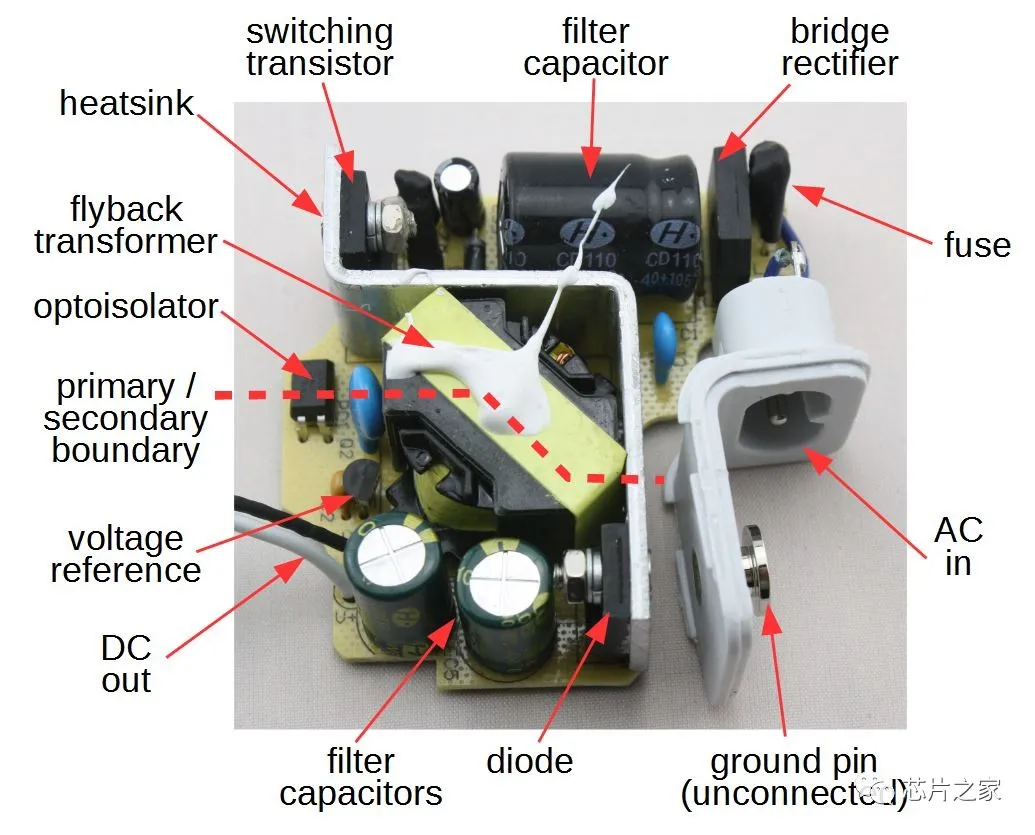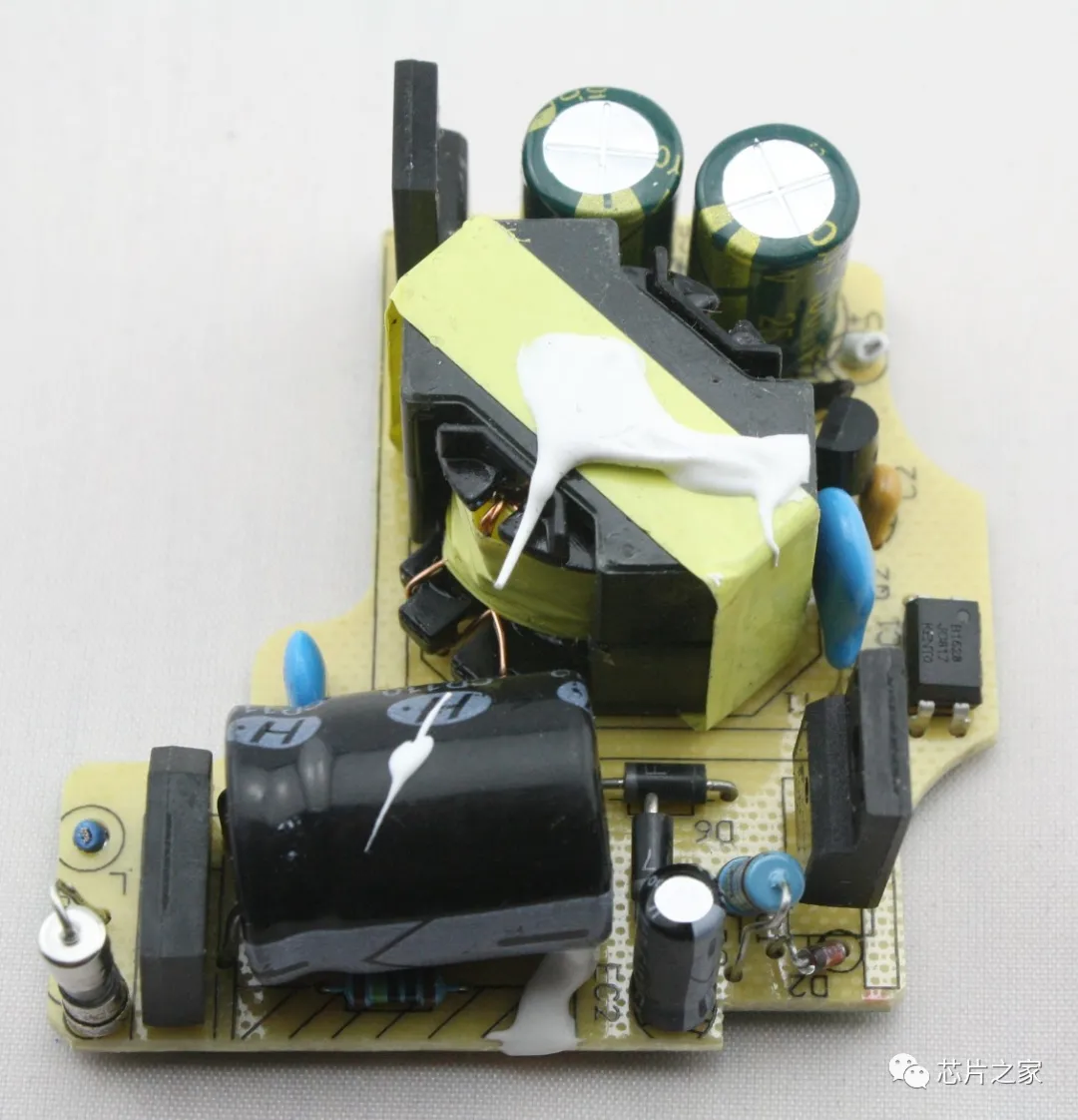 用锤子打开充电器就能看到内部电路了。真正的 Apple 充电器里面是非常复杂的电路,而这款充电器的板子密度相当低,就是一个简单的反激式开关电源。