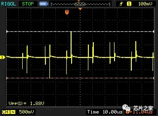 我用示波器测量了假冒充电器的输出功率,如下所示,输出并不平滑,在开关MOS管导通和关断时会出现成对的大尖峰。充电器以大约 60 kHz 的频率运行。充电器内部的更多过滤可减少这些电压尖峰,但成本更高。