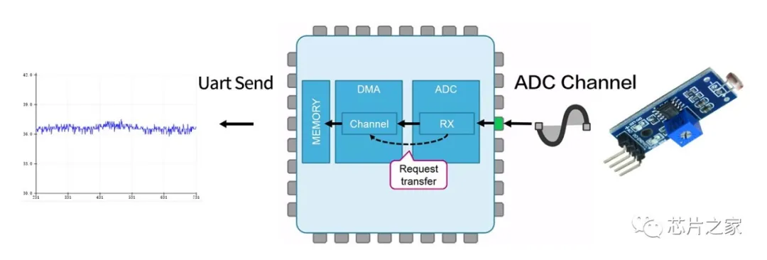 关于DMA,大家应该都有过了解了,DMA控制器依赖于处理器内核,但DMA不影响总线传输,因为DMA控制器总是在系统总线空闲的时候使用总线。该总线实现处理器和DMA控制器之间最优化设计,使两者之间的冲突降到最低,因此传输性能得到提高。如上图所示,我们配置完DMA之后,每次数据采集完毕,DMA会自动的帮MCU把数据运送到我们指定的内存空间,这个搬运不依赖于CPU时钟,所以也算是实现了并行操作,相比在主程序中开启采集,我们的MCU可以有更多的时间去计算运行别的东西。
