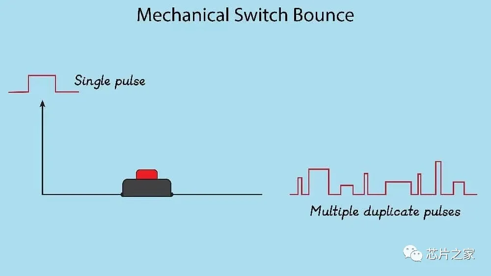 1、按键消抖,在机械按键断开与闭合时,按键的触电是有一点弹性的,按下去的时候不会马上就很稳定的导通,断开也不会马上彻底断开,它是有一个过程的,中间是有抖动的,所以当我们检测到按键状态发生变化时,不应该马上响应,而是等待一小段时间再去重复检测一次,确保状态真的变化了,再进行处理,这个时间一般10-20ms就可以了,下图真实的展示了按下去时候输出的波形