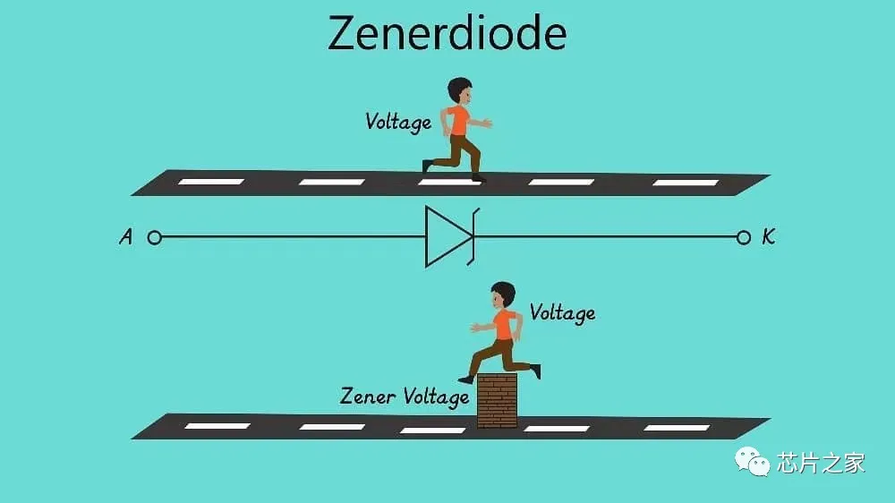 2、齐纳二极管,又称稳压二极管,齐纳二极管允许电流正向流动,在这种情况下,齐纳二极管的行为就像普通二极管一样。每个齐纳二极管都有反向击穿电压,对于不同的齐纳二极管,反向击穿电压的值也不同。当施加小于击穿电压的反向电压时,齐纳二极管像普通二极管一样阻止电流,但是当反向电压大于击穿电压时,齐纳二极管开始反向传导。当齐纳二极管反向导通时,两端的电压降几乎等于反向击穿电压。