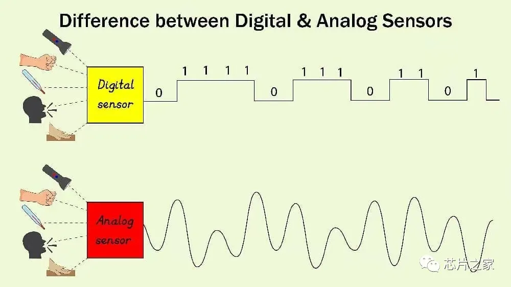 4、数字&模拟传感器,有一些传感器输出的信号是数字的,通过指定的协议读取写入数据,还有一些是模拟的,输出是一个连续变化的电压信号,给到外围电路或者芯片读取检测。