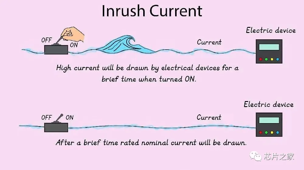 5、浪涌电流,电流其实跟水流蛮像的,浪涌电流是电源或电气设备在接通时消耗的瞬时高输入电流,在开闸的瞬间冲击非常大,大家想象一下水流就明白了,实际上电流的速度超级无敌快,如果没有限制,那么大电流除了会在电源线上产生电压骤降之外,还会损坏设备,并导致由同一电源供电的其他设备发生故障,我们平时设计的电源部分,有些场景也是需要做缓启动的,避免启动瞬间很大的电流冲击。