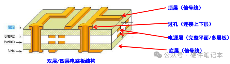 TOP层(元件&走线)-> 内电层(GND地)-> 内电层(PWR电源)-> BOTTOM层(元件&走线)。