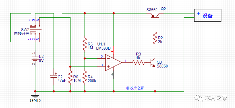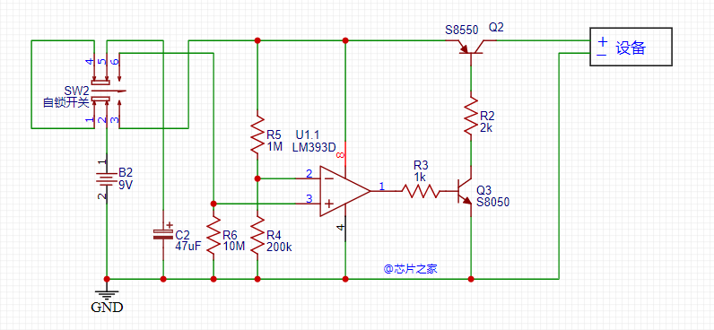 当自锁开关按下后,23,56导通,一路,电容C2通过开关将电压加在电阻R6上与比较器U1的同向端,另一路,电池通过开关将电压加在R4,R5上,比较器的反向端电压为1.5V,因为电阻R6的阻比较大,所以C2的放电速度也比较慢,比较器的同向端电压大于反向端,比较器输出高电平,Q2,Q3导通,电池持续向设备供电,一段时间之后,C2上的电压不断下降,当低于1.5V的时候,比较器输出低电平,Q3截至,Q2也截至,断开给设备的供电。