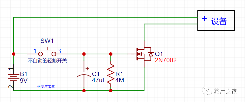 轻触开关按下之后,电池给C1电容供电,MOS管导通,设备通电;按键弹起之后,由于电容容量较大,47uF电容给4M电阻放电,具体不写公式了,实测大概5分钟左右设备断电。