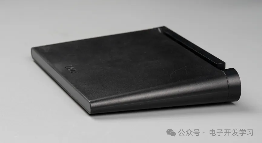 另外它这个造型,不是常见的方方正正的产品,而是一个楔形的设计,前面薄,后面厚。你说这个设计漂亮也说不上,但是总感觉是有点设计感在里面。