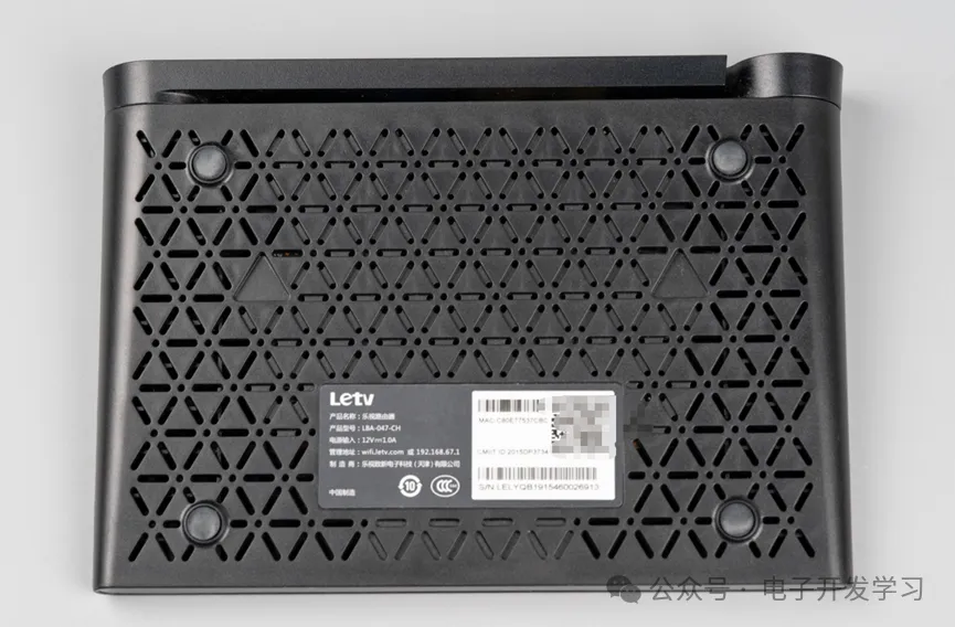 它底部的散热三个开孔形式也挺特立独行。铭牌上写的型号是LBA-047-CH。这个路由器是乐视在2015年发布的,距离现在已经10年了,这个路由器的最高速率才300Mbps,放在现在已经完全不够看了。